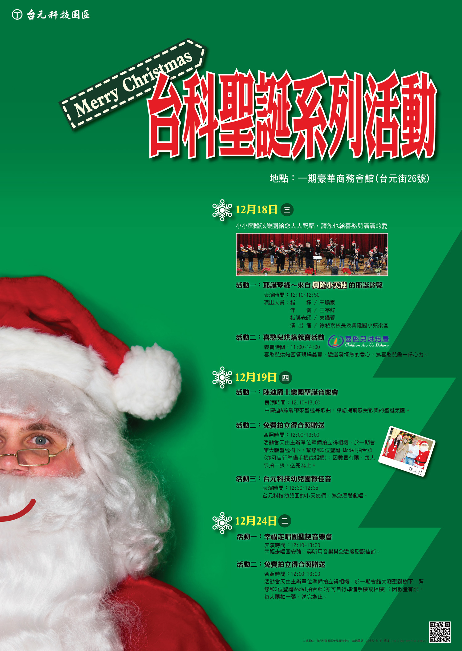 今年的聖誕活動很不一樣,除了邀請爵士天團陳迪孫靚及幸福樂團為大家帶來聖誕曲目外,首次至台科演出的興隆國小弦樂團師生精彩的演出贏得滿堂喝采,而台元科技幼兒園的小小聖誕老人報佳音更是吸引大朋友爭相拍照,當然也有最受歡迎的與聖誕女孩拍合照活動。