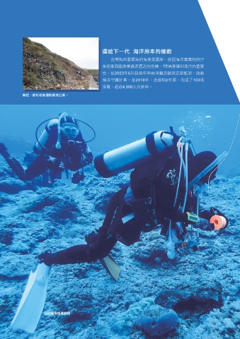 系 列 報 還給下一代 海洋原本的樣貌 導 台灣為四面環海的海島型國家,卻因海洋廢棄物的汙 染逐漸面臨漁業資源匱乏的危機,TEIA意識到海洋的重要 性,從2003年6月起每年舉辦淨灘活動與定期監測,啟動 海洋守護計畫。至2018年,走過5個年頭,完成了103場 淨灘、超過4,000人次參與。 曾經,被垃圾掩埋的潮境公園。 為台灣珊瑚礁體檢。 18