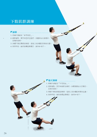 下肢肌群訓練 蹲舉 1. 將繩子調整至「中等長度」。 2. 面對錨點,雙手伸直抓住握把,身體採站立姿穩定, 並微向後傾。 3. 身體下蹲至雙膝呈90度,接著上抬身體回到開始位置。 4. 保持呼吸、維持身體姿勢穩定,操作8~10下。 槍式蹲舉 1. 將繩子調整至「中等長度」。 2. 面對錨點,雙手伸直抓住握把,身體單腳站立姿穩定, 並微向後傾。 3. 單腳下蹲至膝蓋呈90度,接著上抬身體回到開始位置。 4. 保持呼吸、維持身體姿勢穩定,操作8~10下。 26