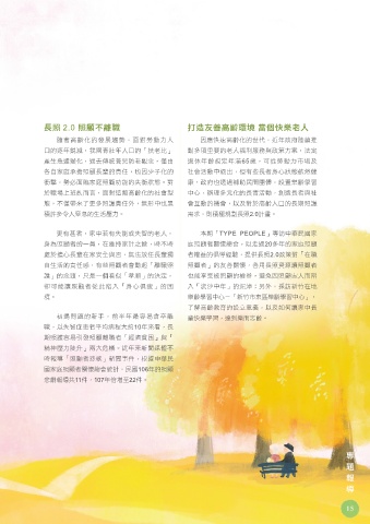 於職場上班族而言,面對這類高齡化的社會型 中心,辦理多元化的長青活動,創造長者與社