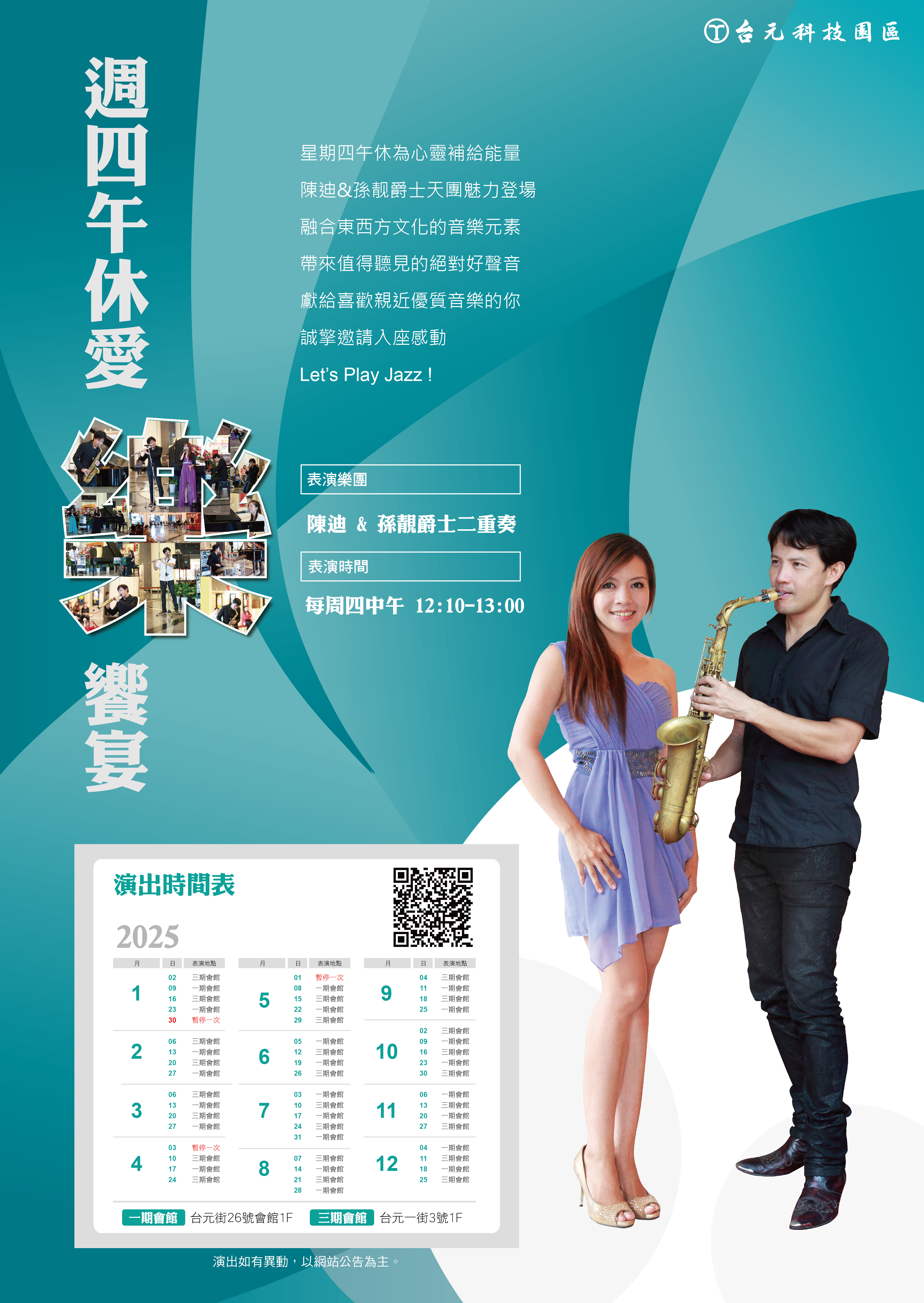 表演樂團:陳迪 & 孫靚爵士二重奏 表演時間:每周四中午 12:10-13:00