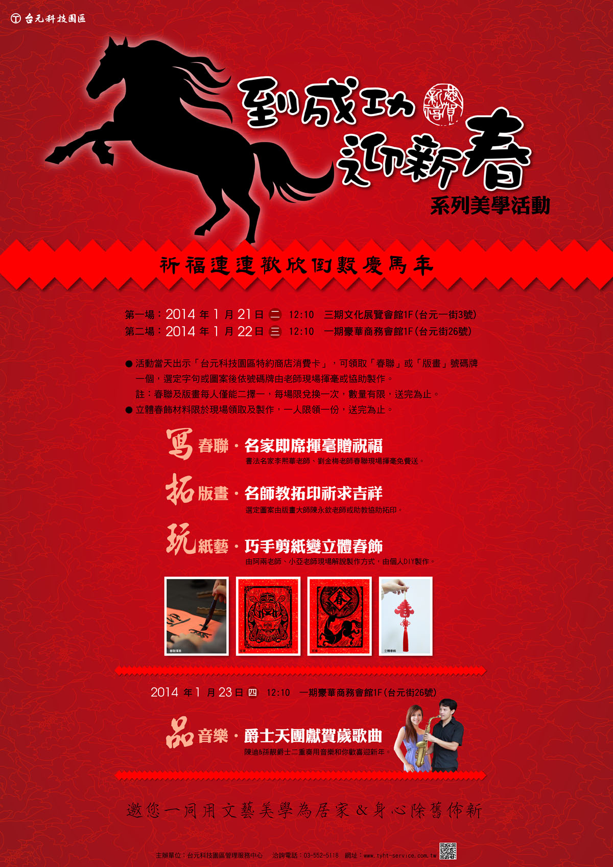 除了慣例由書法名家即席潑墨揮春贈祝福,台科管理服務中心更首度邀請版畫名家陳永欽教拓印年畫、手作達人小亞&阿兩老師領著大家巧手剪紙DIY立體春飾,陳迪&孫靚爵士天團則帶來連串賀歲歌曲,豐富多元的活動內容且能帶回迎接馬年之祈福品,大獲參與者好評。