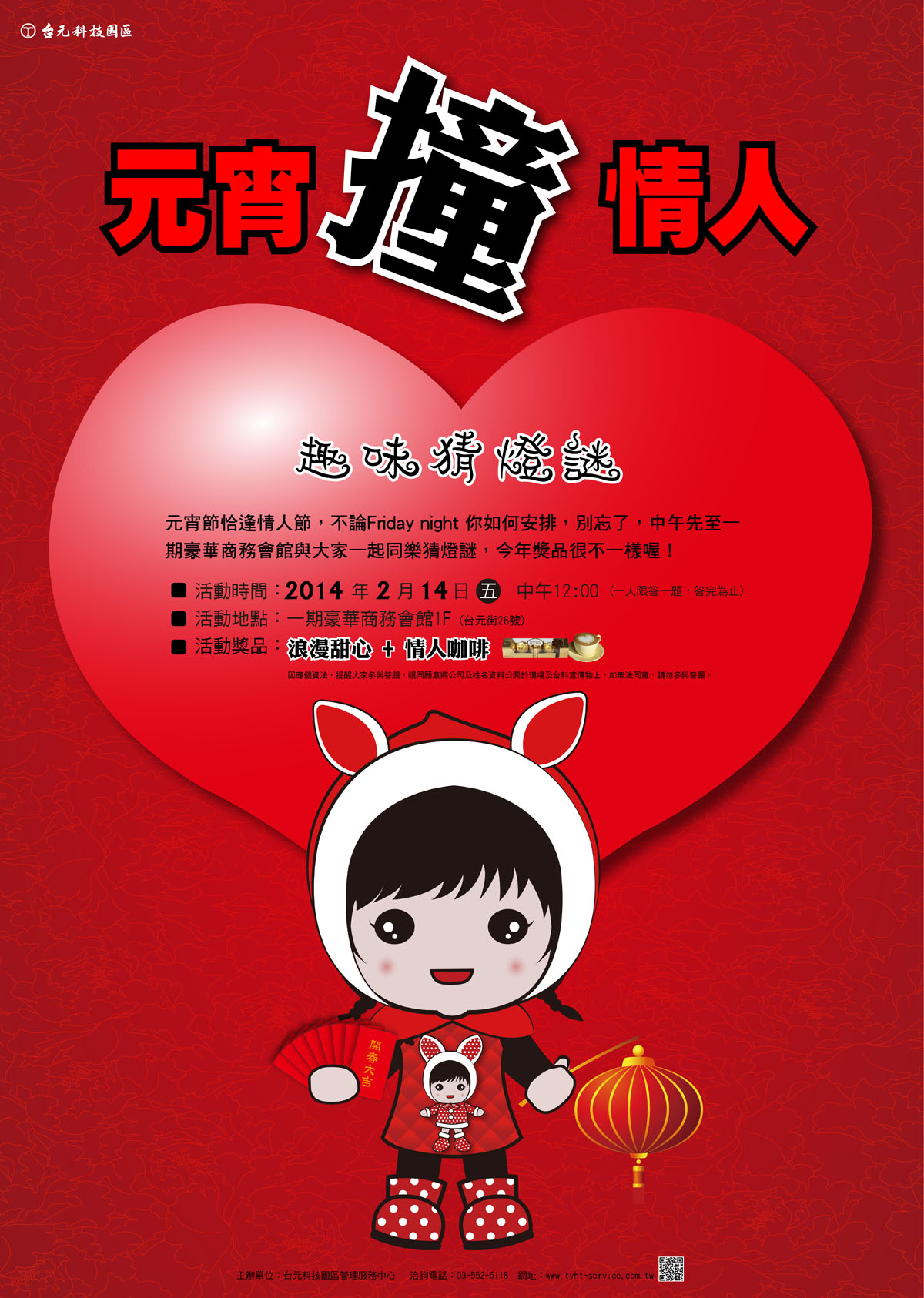 新春的最後一天既是元宵節亦是西方情人節,東西方傳統19年一遇,使過節氣氛加倍濃。交融兩大節日的精神,台科管理服務中心特別加碼今年的趣味猜燈謎獎品,以浪漫甜心巧克力及情人咖啡兌換券雙重好禮,同時祝福大家元宵節&情人節快樂。
