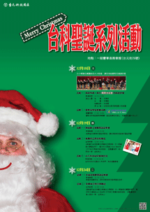 今年的聖誕活動很不一樣,除了邀請爵士天團陳迪孫靚及幸福樂團為大家帶來聖誕曲目外,首次至台科演出的興隆國小弦樂團師生精彩的演出贏得滿堂喝采,而台元科技幼兒園的小小聖誕老人報佳音更是吸引大朋友爭相拍照,當然也有最受歡迎的與聖誕女孩拍合照活動。
