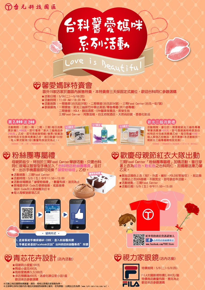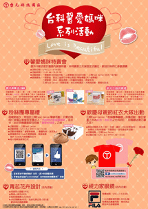 解決台科人選購母親節禮物的煩惱,管理服務中心邀請區內店家包括視力家眼鏡公司、青芯花卉設計、真善美藥妝店,及區外知名業者新光三越百貨新竹中華店、台北君悅酒店、阿默蛋糕、HOLA等,在園區內聯合舉行展示特賣會。各參與店家大方祭出眾多折扣,不僅讓台科人買到物超所值的孝親禮品,業者也笑納3天破百萬的佳績。