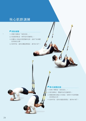 核心肌群訓練 仰臥捲腹 1. 將繩子調整至「最長長度」。 2. 採屈膝仰臥姿,兩手握於套腳環上。 3. 身體向上捲曲至肩膀離開地面,接著下放身體 回到開始位置。 4. 保持呼吸、維持身體姿勢穩定,操作8~10下。 棒式捲腹訓練 1. 將繩子調整至「最長長度」。 2. 採肘撐棒式,雙腳背放於套腳環內。 3. 雙腳屈膝往胸口方向捲曲,接著向下延伸雙腳 回到開始位置。 4. 保持呼吸、維持身體姿勢穩定,操作8~10下。 28