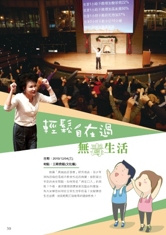 系 列 報 導 無 生活 日期:2019/12/04(三) 地點:三期會館(文化廳) 根據「美國癌症協會」研究指出,至少有 35%的癌症是經由飲食引起的病變,面對層出 不窮的食安問題,如何降低「病從口入」的風 險?今晚,資深護理師譚敦慈蒞臨台科園區, 為大家解答如何從日常生活中防毒?改變哪些 生活習慣,就能輕鬆打造無毒的健康飲食? 30