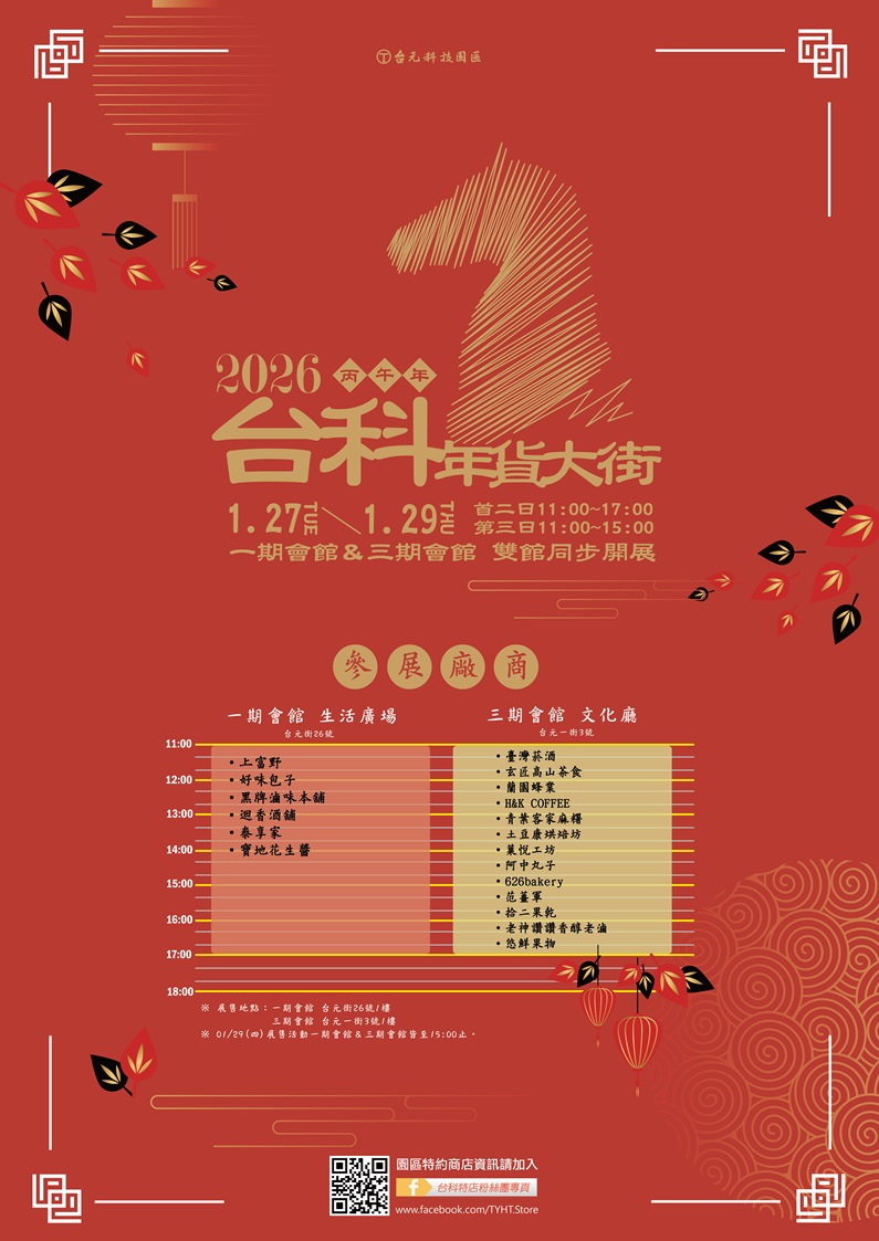 活動日期:2026/01/27(二)~01/29(四) 活動時間:首二日11:00~17:00/第三日11:00~15:00 活動地點:一期會館(台元街26號)、三期文化廳(台元一街3號) 雙館所有廠商同步展售 參與店家:共19家廠商於園區現場販售 《一期會館》 ★ 上富野 ★ 好味包子 ★ 黑牌滷味本舖 ★ 迴香酒舖|立即下載優惠PDF檔案 ★ 泰享家 ★ 寶地花生醬