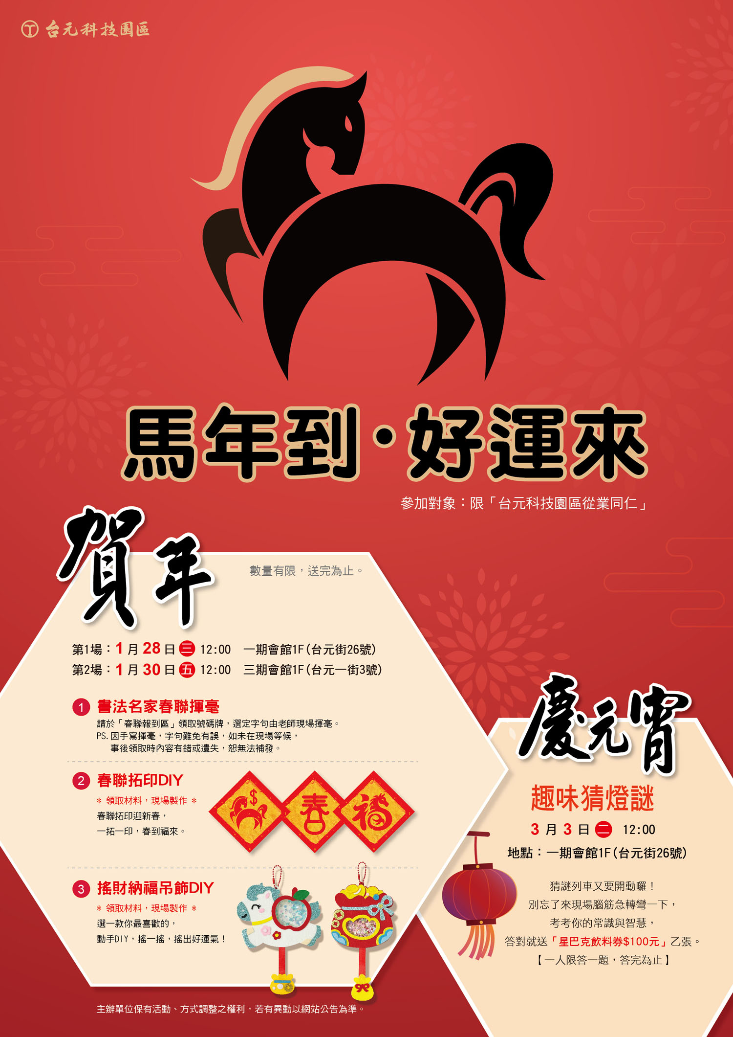 索取春聯注意事項: 1.請於「春聯報到區」排隊領取號碼牌,數量有限,送完為止。 2.指定老師及選定字句後,將號碼牌交由工作人員。 3.如未在現場等候老師完成揮毫,事後領取,如發現有遺失、毀損或內容錯誤,怒不補發。 4.未於現場等候老師揮毫,請於活動後,於下面地點領取。 第1場:領取日期:1月28日(四)後,一期管理服務中心櫃檯領取。 領取地點:台元街26號會館2樓 第2場:領取時間:2月02日(一)後,三期管理服務中心櫃檯領取。 領取地點:台元一街7號1樓之1